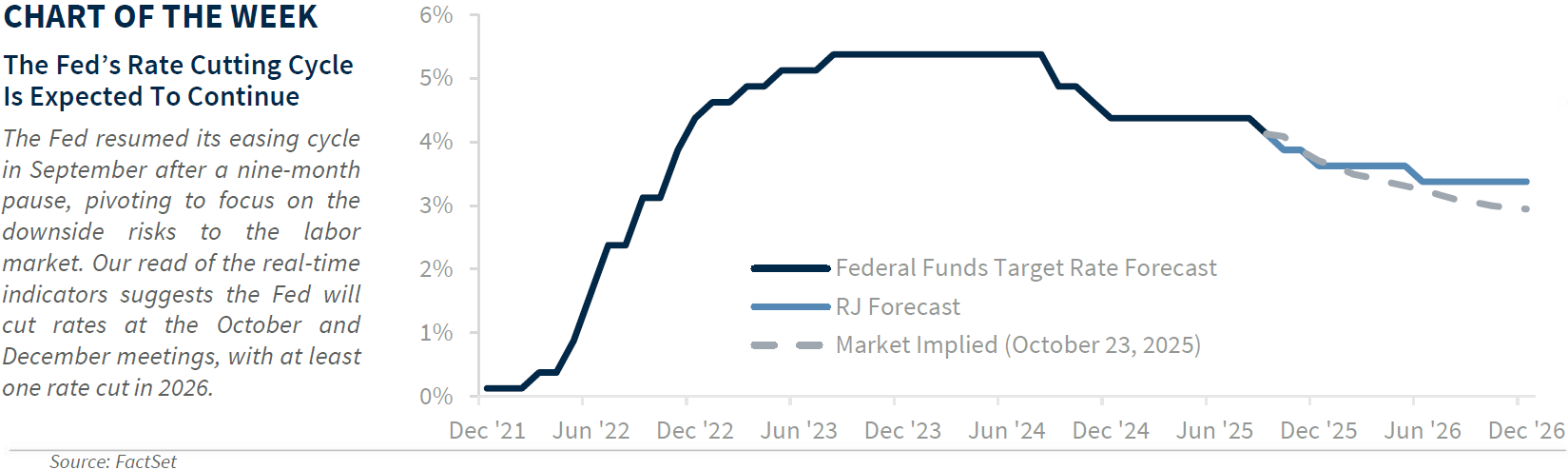 - Fed ‘Officials’ Widely Expected To Deliver Another Rate Cut | The recent government shutdown has left a gap in official economic data, but that’s unlikely to change the outcome of next week’s Fed meeting. A 25 bp rate cut is still widely expected, as recent Fed commentary has leaned toward more easing − though with caution. Chair Powell even noted that little has changed since September, signaling a green light for a cut and hinting that the end of quantitative tightening (reducing the assets on the Fed’s balance sheet) may be near. With limited data, Chair Powell’s post-meeting press conference will carry outsized importance. Expect him to explain the Fed’s focus on managing labor market risks, while acknowledging the challenge of making future decisions without the usual flow of economic reports. Our read of real-time indicators suggests more cuts are likely (one more this year alone in December), though not as aggressive as the five cuts currently priced in through 2026. And keep an eye on a potential wildcard: the next Fed Chair could be announced by December.